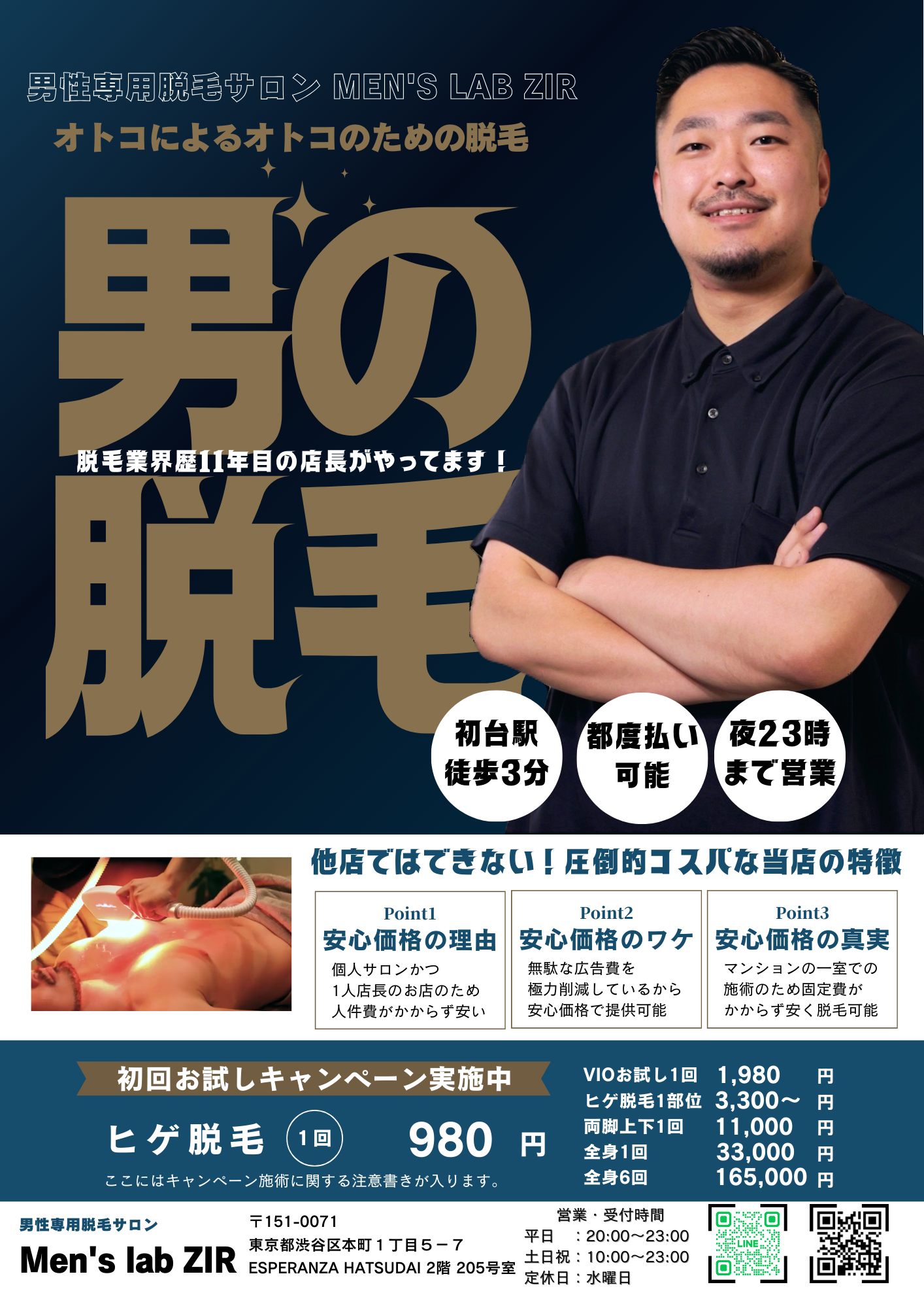 渋谷・初台にあるメンズ脱毛サロン「ZIR」は、大手サロンと同等の最新機器を導入しながらも、圧倒的に通いやすい価格を実現した、地域密着型の脱毛サロンです。
